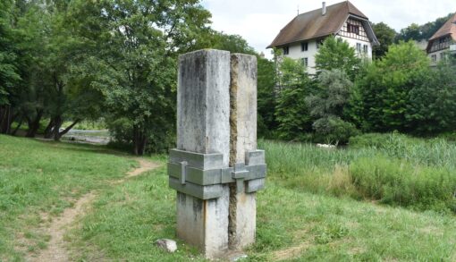Langsam aber sicher haben wir die Sprachbarriere durchquert. Bonjour. Bienvenue en Suisse romande à Fribourg. Bienvenue de l’autre côté du Rösitgraben. Hier erwartet uns das letzte Denkmal. Unter der St.-Johann-Brücke am Ufer der Saane befindet sich dieses Werk aus einem grauen Kalkblock, zusammengehalten durch ein gusseisernes Band. Es ist das Röstigraben-Denkmal. Der Röstigraben trennt die Deutschschweiz und die Romandie. Es sind kulturelle und sprachliche Unterschiede, die uns trennen. Darüber hinaus spricht man auch von einem unterschiedlichen Stimmverhalten, besonders in aussenpolitischen Entscheidungen. Die Westschweizer zeigen sich in diesem Bereich tendenziell weniger bürgerlich.